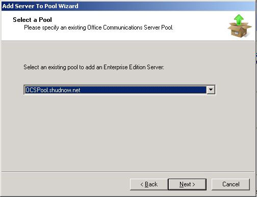 Once the roles have been installed on your Front End Server, you will have to specify what Pool we want to join this server to. Considering we only have one pool, leave the selection (don’t have much of a choice) at OCSPool.shudnow.net. Click Next to Continue.