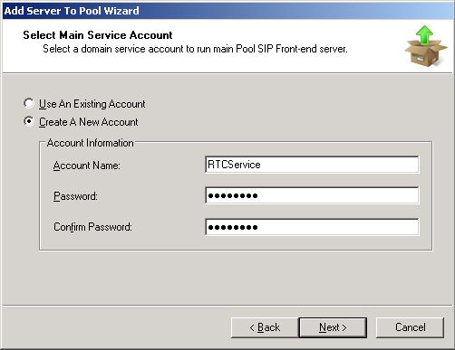 I tried to add server to pool, but at select main service account stage, the system shows RTCService as Use An Existing Account and asks a password I didn’t put before (what password is it for that?). So I created RTCFService as Create A New Account and entered a new password. I did the same for RTCFComponentService and RTCFGuestAccessUser. But the run failed with error 0x80070533 on RTCFService account saying it is a desactivated account and failure of opening session. I got the same error on Activate ConferencingServer and on Activate Enterprise Edition Server.