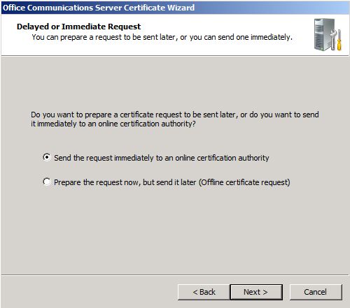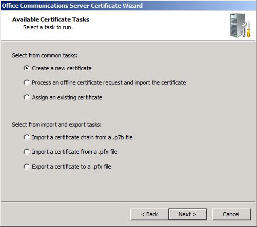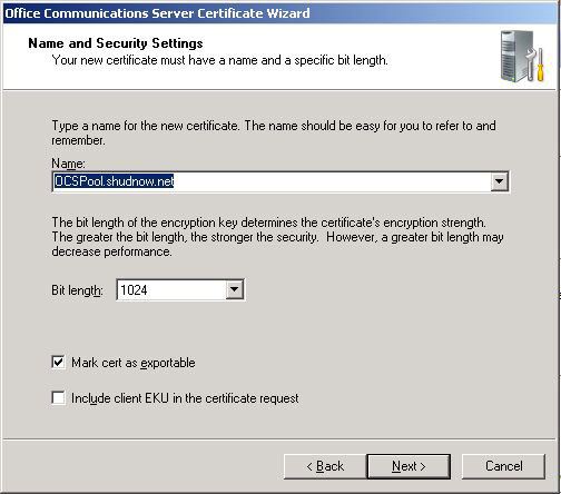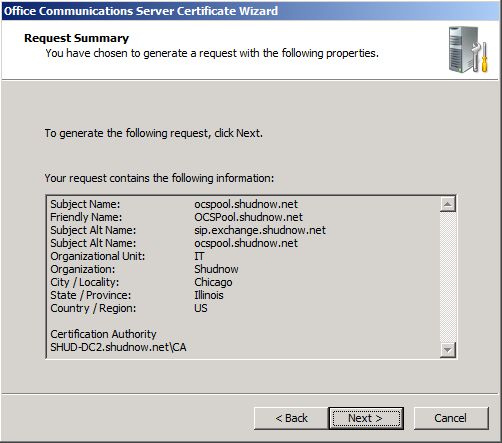 Note: The Certificate Name is not the Subject Name (SN) / Common Name (CN) of the certificate, but I always match the SN / CN of the certificate to the Certificate Name. On a Standard Edition Server, this would be the FQDN of the server’s computer name. When deploying OCS in an Enterprise Pool, this would be the FQDN of the pool name, not the server name. You would then export this certificate after you have obtained the certificate and place the certificate on all other Front End Servers.