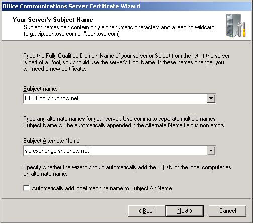 You will now be asked for your SN / CN. As stated previously, because we created an Enterprise Pool, we want this name to be the FQDN of our Enterprise Pool. Because we will be using a second SIP domain (exchange.shudnow.net), we will need to add a Subject Alternative Name (SAN) for sip.exchange.shudnow.net (sip.SIPDomainName.TLD). The SAN should automatically be filled in for you due to Step 4 which is when we Configured our Pool. Click Next to Continue.