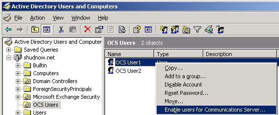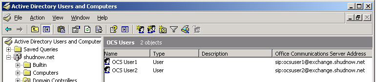 I would now go ahead and OCS enable your second user. Once finished, you can refresh ADUC and verify these users have a Communications Server address.