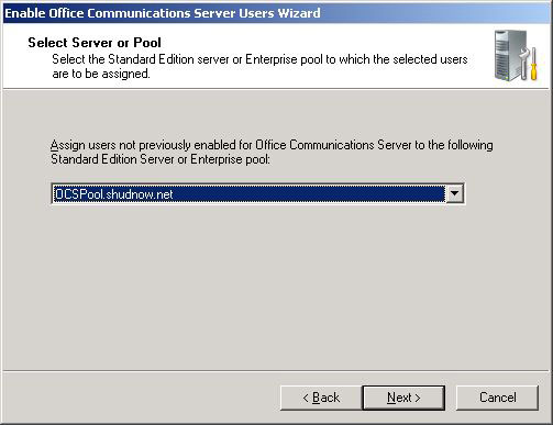 We now must choose what Pool we want to assign this user to. Considering we only have one pool, leave the selection (don’t have much of a choice) at OCSPool.shudnow.net. Click Next to Continue.