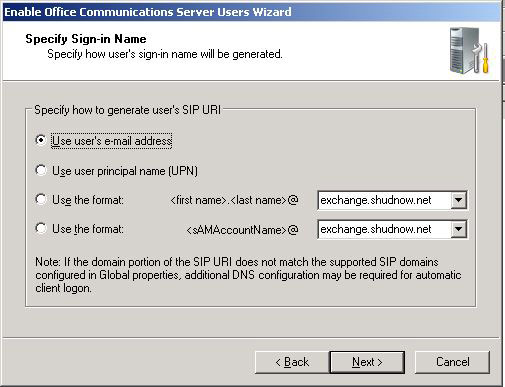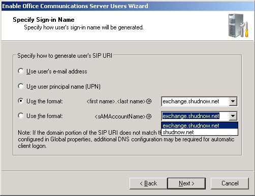 But let’s say you wanted some users to have a different OCS SIP Address than their Exchange address. Or even if you wanted to use the shudnow.net domain for SIP. You could choose the following option although you can e ither choose only firstname.lastname@SIPDomain or sAMAccountName@SIPDomain.