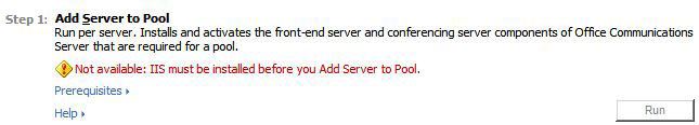 We are now on Step 1 which is to Add Server to Pool. As a prerequisite, you’ll need to install IIS by following the instructions here for Server 2003 and here for Server 2008. For Server 2008, make sure you install Windows Authentication and all IIS 6 Management Compability Role Services. You may also need your SP2 binaries and CD1 of your Server 2003 Installation CD. Once IIS has been installed, you will have to restart Setup. Once back at the Deploy Pool in a Consolidated Topology, Click Run to Continue.