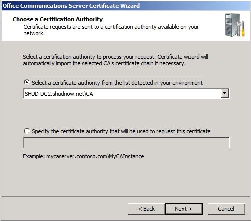 Since we specified the OCS Certificate Request to send the request immediately to an online certificate authority, OCS will search for an Issuing CA. The name of our CA (not server name but the name of the CA) is CA, OCS will display this server as the CA to use. Choose SHUD-DC2.shudnow.netCA as our CA. Click Next to Continue.