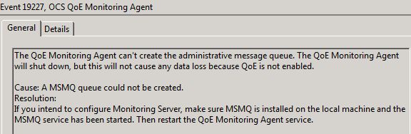 Note: I did notice an issue with the Monitoring Agent not being able to start. I then noticed in the Event Viewer that this service is for QOE and it can’t start because it can’t create an administrative message queue. Because we didn’t choose to deploy QOE, I have disabled this service. If QOE is needed in the future, you can set up QOE and re-enable this service.