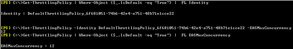 Let’s say we wanted to modify EAS to throttle and allow 12 connections. Our organization has a lot of EAS activity and we determined we want to bump up this value just a little bit. We would run the following cmdlet: