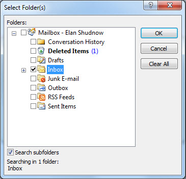 The reason I say may, is because the “Mail from these folders will be included in this Search Folder” by default.  What I noticed was, is that when I looked at some mailboxes, they had it set to Inbox and when I looked at other, it had it set to the following which had no problems with OVA playing back the voice mails: