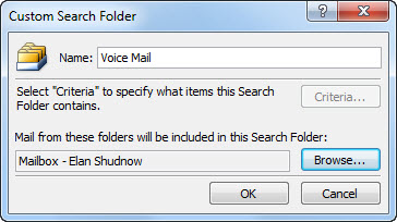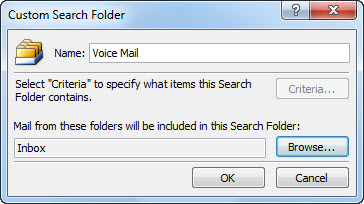 If we Right-Click our Voice Mail Search Folder and Choose Customize this Search Folder, we may see the following: