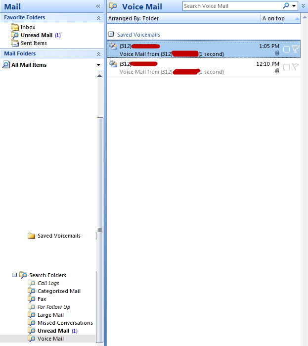 Now if I look at my Voice Mail Search Folder, I successfully see my voice mails stored in my Saved Voicemails subfolder: