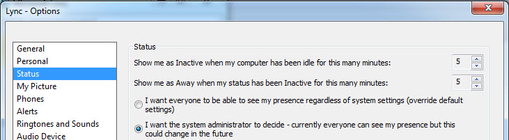 Once users have logged back in, we can go back to the Lync 2010 options, go to status, and we see some new options.