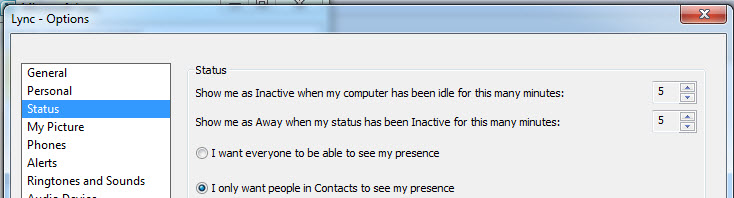 In the Lync 2010 client options, we see there are no options to prevent anybody from seeing our presence if they are not on our contact list.